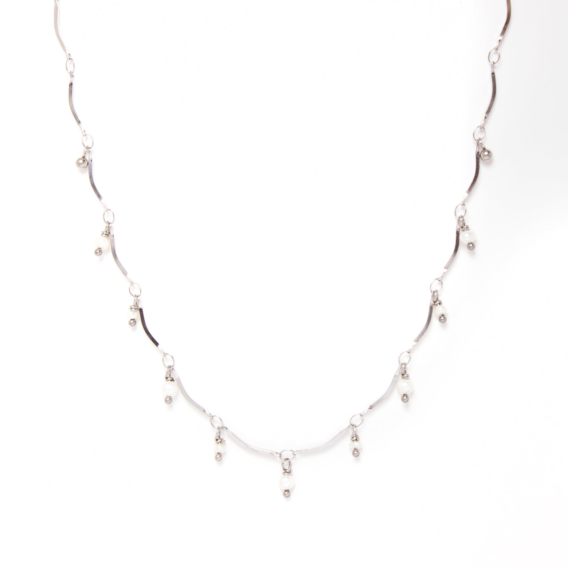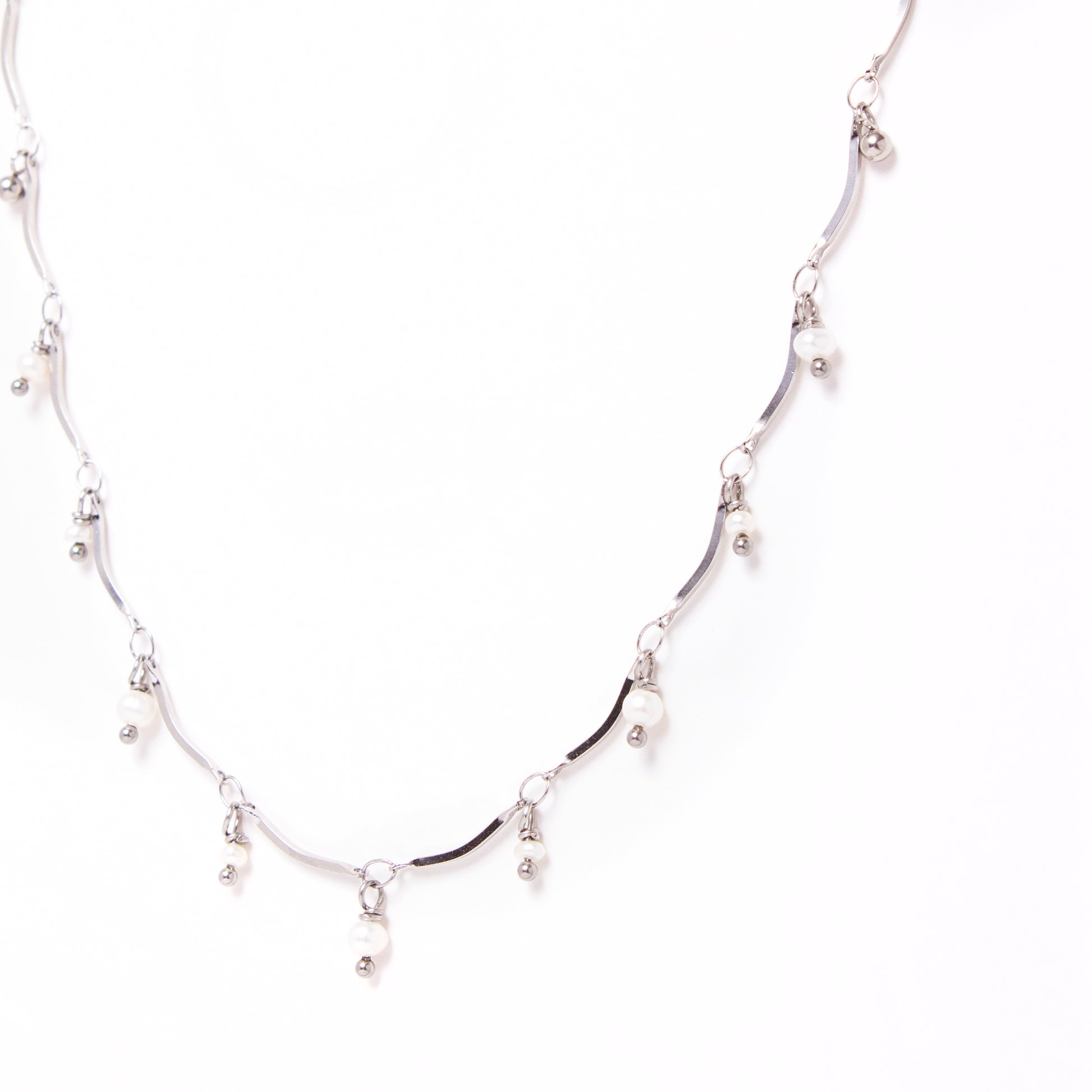 Delicate and distinctive, the Arch Charms Silver Necklace features a gently curved herringbone chain adorned with freshwater pearl charms and silver bead accents. Each charm is thoughtfully spaced to create a playful yet elegant movement, perfect for layering or wearing as a statement on its own. Crafted in high-polish silver-tone metal, this piece offers a modern twist on classic charm necklaces, effortlessly elevating any look.